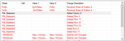 We can now see that some formulas have changed and some structural changes have been made (renaming of sheets, deleting rows and columns). Additionally, one change in a macro has been made (among other things).